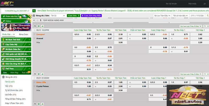 Bởi vì nguồn dữ liệu về tỷ lệ kèo cược sẽ luôn được các nhà cái cập nhật thông tin rất là chính xác. Không những thế số lượng kèo vừa đa dạng, vừa phủ rộng với nhiều giải bóng đá lớn. Ví dụ như khi các bạn kết nối đến trang cá cược NBET. Lúc này, bạn có thể xem tỷ lệ soi kèo nhà cái đối với các giải đấu uy tín như EPL, La Liga, Series A, Bundesliga, C1,…